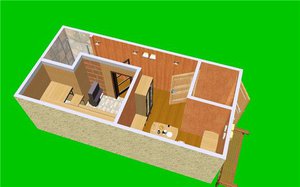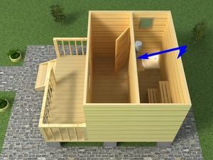 Иногда в целях экономии планировка для маленькой бани включает только два помещения — парную и предбанник. При такой схеме планировки парная выполняет роль помывочной, а предбанник служит одновременно прихожей, раздевалкой и комнатой отдыха. Тогда печь выносится в парное отделение, а загрузку топлива в нее осуществляют непосредственно из предбанника, который в рамках этого варианта планировки выполняет функцию топочной.