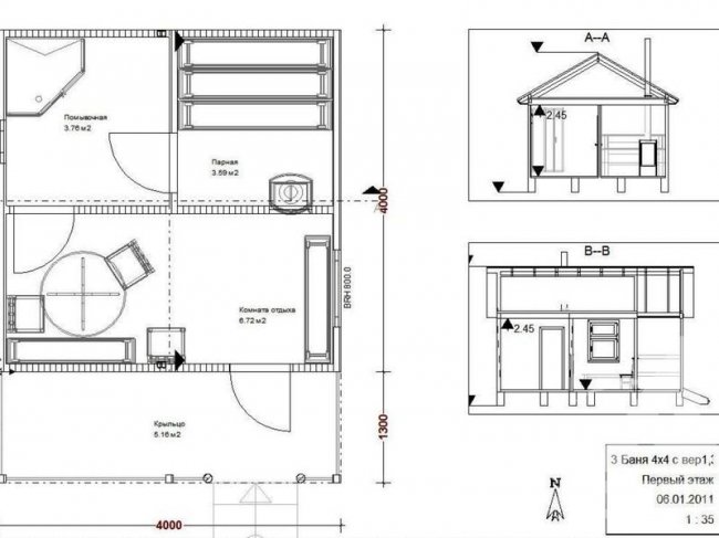 При составлении проектов для бань размерами 3 x 4 метра из профилированного бруса выбирается планировка, включающая три обязательных помещения: