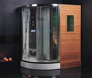 Проживая в холодной многоэтажке, наверняка у многих владельцев возникало желание насладиться банным паром. Но если пару десятилетий назад это оставалось всего лишь несбыточной мечтой, то сегодня это вполне осуществимо. Производители учитывают самые нестандартные потребности покупателей и предлагают сегодня такое современное решение, как гидробокс с функцией сауны. Содержание Модификации душевых боксов с сауной и их различия Гидробоксы с функцией парилки Душевые боксы, комбинированные с сауной Гидробоксы с инфракрасным подогревом парилки Особенности монтажа гидробокса с сауной Заключение Думается, что даже те, кто и не думал об устройстве парилки в своем санузле, не откажется от того, чтобы поближе познакомиться с возможностями этого сантехнического чуда, его конструкцией и правилами монтажа. Модификации душевых боксов с сауной и их различия Хотя сегодня магазины предлагают весьма скудный выбор подобных сантехнических устройств, даже доступные потребители модели имеют определенные конструктивные отличия. Первый тип — душевые кабины с сауной, которые выглядят в виде гидробокса, в котором в качестве дополнения присутствует баня. Второй тип — душевые боксы, которые сочетают в себе парилку. Отличием этого сантехнического прибора является то, что гидробокс, и парилка выполняют каждый свою функцию, поэтому они разделены друг от друга переборкой. Впервые увидев эту кабину, можно подумать, что она состоит из двух отдельных устройств. Однако это не так. Чтобы четко понимать разницу между ними, необходимо знать устройство этих конструкций. Гидробоксы с функцией парилки По своему конструктивному исполнению эти кабины с душем-парилкой не отличаются от обычных: в них также присутствует крыша, дверца, поддон и прочие элементы, которые являются обязательными для стандартных гидробоксов. Из особенностей стоит выделить то, что в них установлен парогенератор. Это устройство используется для испарения воды и охлаждения пара до 50 °. Но чтобы остаться довольным работой парилки, придется немало потрудиться — необходимо создать определенные условия для правильной работы генератора пара. Следует сказать, что этот прибор будет работать надлежащим образом, только если в санузел будет поступать вода определенного минерального состава. Чаще всего в квартиры подается жесткая вода, из-за которой в различных приборах образуется накипь. Кулер не предназначен для работы с такой водой и очень скоро засорится. Поэтому, если вы хотите избежать подобной проблемы, вам придется установить специальную систему фильтрации. Если вы решите пренебречь этой рекомендацией, то парогенератор проработает у вас примерно 2 года, а затем придется покупать новый. Еще одно условие, необходимое для правильной работы устройства, связано с напором воды. Вода должна поступать под давлением не менее 3 бар. Если у вас в трубах давление воды недостаточное, то вам придется дополнительно установить насос, который поможет вам создать необходимый напор. Только выполнив все вышеперечисленные требования, вы сможете ощутить всю прелесть от правильно работающего парогенератора. Этот прибор сможет обеспечить достаточно высокую влажность в гидробоксе вплоть до 90%. Благодаря этому и будет обеспечен эффект сауны. Но не ждите, что с помощью гидробокса с душем-парилкой вы