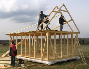 Детали верхнего перекрытия соединяют между собой так же, как цокольную обвязку. Устанавливают её по уровню и с помощью гвоздей или металлических уголков прикрепляют к стойкам. Монтируют балки потолка и можно начинать монтаж щитов.