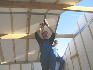 Потолочные стойки подбивают досками и сверху укладывают изоляцию от пара и утеплитель. Строительство окончено. Осталось поставить печь, постелить пол и можно париться в удовольствие.