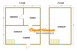 пространство изнутри должно быть разделено ровно на две части. В первой части будет находиться комната для отдыха большая, а во второй, которая тоже должна быть поделена напополам, парилка и комната для отдыха малая;