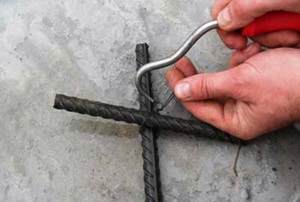Для вязания арматуры при закладке в ленточный фундамент берут проволоку, изготовленную из низкоуглеродистых сталей, чем процент углерода в металле меньше, тем лучше. Проволока должна быть мягкой и податливой, не ломаться при изгибе, помимо этого, она обеспечивает прочность всей конструкции. Слишком толстая проволока неспособна обеспечить тщательное прилегание к арматуре, а тонкая неудобна тем, что для составления узла ее придется сложить вдвое. Если нужно увеличить пластичность проволоки, рекомендуется нагреть ее на огне в течение 30 минут.
