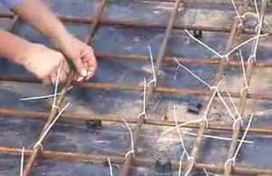 Низ готового каркаса, связанного на поверхности, ставится на кирпичи, или прокладки из другого материала на высоту около 5 см. В продаже имеются готовые компенсаторы для таких целей. Для вязки одной арматурной секции берут около 30- 32 м проволоки. Стержни соединяются в сетке или пространственном каркасе только под прямым углом. Лишняя проволока после формирования узла обрезается.