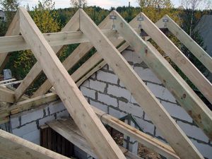 Сперва необходимо установить стропильную систему, включающую в себя основание, стропильную ногу и ригель. Ее делают из обрезной доски размерами 10 x 4 см.