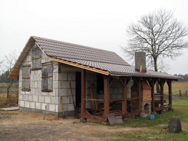 Желание сэкономить часто заставляет владельцев строить не только загородные жилые дома, но и бани. Им приходится самостоятельно решать все возникающие вопросы, в том числе и выбирать материал для строительства. В последние годы довольно популярными стали строения из газобетона. Однако не все владельцы уверены в том, можно ли его использовать для строительства бани. Специалисты хорошо осведомлены о возможностях этого современного материала для частного строительства. Но чтобы владелец мог получить максимальную выгоду от его применения на своем приусадебном участке, ему не помешает сперва ознакомиться с его сильными и слабыми сторонами. Содержание Баня из газобетона: плюсы и минусы Типовой проект Баня из газобетона своими руками Фундаментные работы Кладка стен Укладка стандартной двускатной крыши Отзывы Заключение Баня из газобетона: плюсы и минусы Характеристики будущего строения зависит от многих факторов, среди которых не последнее значение имеет выбранная технология выполнения строительных работ. Особо стоит остановиться на плюсах, которые часто становятся определяющим фактором для владельцев: Материал отлично подходит для строительства бани своими руками, поэтому с этой задачей справится даже начинающий мастер. Если оценивать только стоимость газобетона, то он представляется более доступным материалом, нежели древесина. При условии точного соблюдения требований технологии строительства можно построить крепкое и долговечное здание, которое не потребует ремонта как минимум 20 лет. Баня из газобетона обладает прекрасными теплозащитными свойствами; Газобетон — биологически стойкий материал. Он изготавливается из особых компонентов, которые позволяют ему демонстрировать высокую устойчивость к плесневой и грибковой микрофлоре, что в условиях эксплуатации бани приобретает особенно большое значение. Огнестойкость. Печь в бане является обязательным элементом, но в то же время она предстает в качестве источника потенциальной угрозы, способного вызвать пожар. Использование газобетона снижает вероятность порчи строения из-за того, что он не поддерживает горение, поэтому выбор в пользу этого материала может в некоторых случаях даже спасти жизнь. Малый вес. Это свойство обеспечивает газобетону массу преимуществ — облегчается процесс транспортировки, погрузка и выгрузка, а также выполнение работ, связанных с его использованием в строительстве. Владелец может реализовать любой проект своими силами, не прибегая к услугам бригад рабочих. В отличие от дерева газобетонные блоки не дают усадки, а это экономит немало времени, позволяя сразу же после завершения основного объема работ начать отделку бани. Это существенно ускоряет введение бани в эксплуатацию. Перед строительством бани необходимо определиться с оптимальной толщиной стен, а для этого необходимо принять во внимание условия ее эксплуатации. Если планируется пользоваться ею не чаще одного раза в неделю, то толщина стен должна составлять 25 см, а если ежедневно — не менее 40 см. Но даже обладая столь впечатляющими преимуществами, газобетон имеет и не менее серьезные недостатки: Материал плохо выдерживает воздействие влаги, впитывая ее как снаружи, так и изнутри. При длительном контакте происходит изменение теплоизоляционных свойств и начинается р