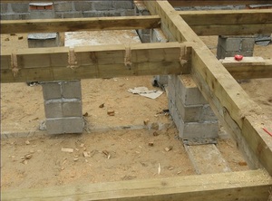 С целью дополнительно гидроизоляции между брусьями или столбами стелят рубероид. Расстояние от земли до лаг должна составлять около 20–25 сантиметров. Сложность состоит в том, чтобы создать ровную поверхность, для этого столбики должны быть точно одинаковыми по высоте.