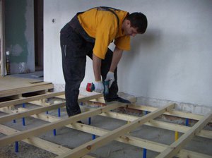 Выравнивается пол — деревянные лаги являются быстрым и бюджетным методом выравнивания пола перед монтажом финишного покрытия — плитки, ламината и т. д.