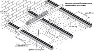 трамбовка грунта, засыпка щебнем и заливка бетоном;