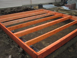 Поверхность очищается от дёрна. Насыпается слой гравия около 50 мм, утрамбовывается и заливается бетоном также толщиной 50 миллиметров. После этого следует укладка гидроизоляции, утеплителя и стяжки. Оптимальное расстояние между лагами 350-400 миллиметров.