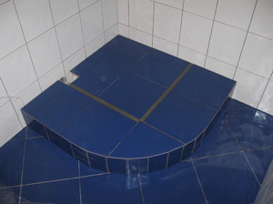 Дайте бетонной стяжке тщательно высохнуть. После этого покройте дно и стенки основания грунтовкой и выполните гидроизоляцию поддона. Когда грунтовочный состав тщательно просохнет, можно приступать к облицовке душевого поддона своими руками. Наиболее популярным и доступным облицовочным материалом для душевых поддонов является керамическая плитка. Существуют также керамическая мозаика, плитка из керамогранита, гранита и натурального мрамора - эти варианты смотрятся эффектней, но они гораздо дороже. Для облицовки воспользуйтесь клеем или цементным раствором.