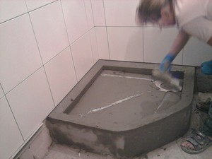 Далее необходимо выполнить стяжку, используя бетонную смесь на том участке пола, где будет установлен поддон. Оптимально выполнять работы по заливке бетона одновременно с капитальным ремонтом пола и установкой труб ванной комнаты - так вы будете уверены в стопроцентном качестве и надежности душевой конструкции.