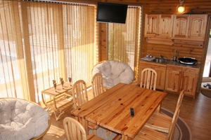 Главными атрибутами являются стол и скамьи из натурального дерева.