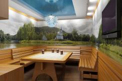 Интерьер комнаты отдыха в сауне и бане должен располагать к максимальному расслаблению. Уникальным в своем роде материалом является древесина, которую можно использовать как для внутренней отделки, так и для мебельного оформления. Те, для кого важен расслабляющий отдых, в качестве отделки должны выбирать материалы пастельных тонов. Ну а если сауна и баня используются для придания бодрости, то комната отдыха должна, наоборот, оформляться в активной цветовой гамме. Здесь важно следить, чтобы комната отдыха в сауне полностью гармонировала с теми предметами, которые в ней находятся.