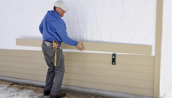 Начинают монтаж сайдинга от центра стены к ее краям.