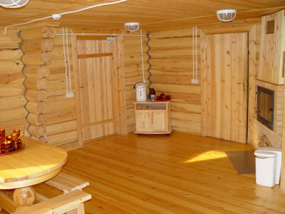 Отделка предбанника и других помещений, где нет высокой температуры, и не льется вода, может быть выполнена с использованием любых подходящих материалов, но в целях создания единого гармоничного ансамбля предпочтительнее использовать дерево лиственных пород.