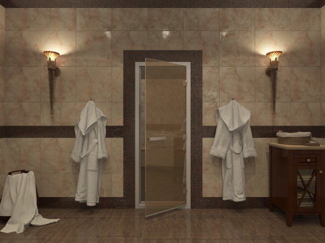 Обычно в общественных хаммамах делают три помещения, но в домашних условиях достаточно и одного. Только представьте себе, потолок и стены из мрамора, а в дверном проеме красуется прозрачная, стеклянная дверь для хаммама. Кстати, двери для хаммама должны быть обязательно изготовлены из жаропрочных материалов, поэтому ее изготавливают из закаленного термостойкого стекла. При установке обеспечивают небольшой зазор для хорошей циркуляции воздуха, а уплотнители из силикона гарантируют плотное и тихое закрытие двери.