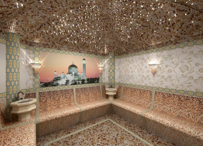 Потолок в хаммаме не должен быть ровным, так как из-за большого количества пара оседающего на стены в виде конденсата, вода может капать на сидящего человека. Потолок выполняют в форме купола, что помогает воде равномерно стекать и не капать на посетителей. Соответственно высота парной в центре должна быть не ниже 270 см.