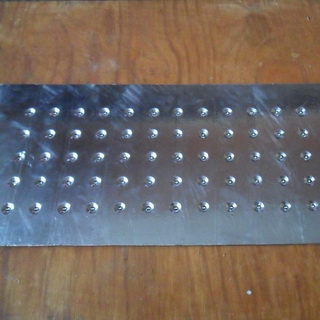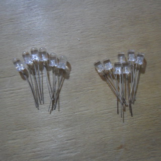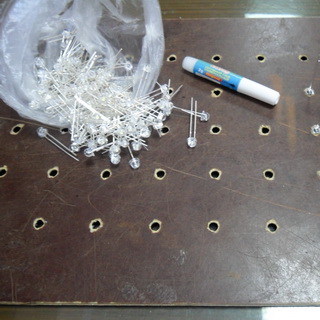 6. На обратную сторону панели суперклеем прикрепляют светодиоды (80 шт.), спаянные по 4 шт. Всего получится 20 светодиодов — по 4 в каждой из точек. Светильник рассчитан на 12 В. Отражателем для светодиодов будет служить скотч из алюминия.