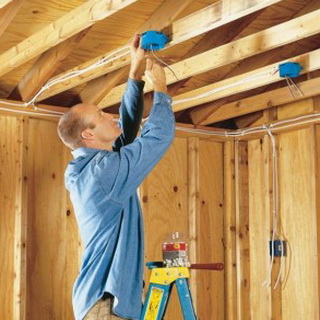 Если в комнате отдыха проводка заключена в пластиковый кабель-канал, то провести ее еще проще. На поверхности кабель-канала есть специальные вставки — суппорты, рассчитанные на 1—2 или даже 10 электрических точек. Помимо этого имеются посадочные коробки, распределительные коробки для открытой проводки. Кабель-канал при этом должен иметь соответствующую ширину. Распределительные коробки открытого типа прикрепляют дюбель-гвоздями, шурупами или обыкновенными гвоздями к перекрытиям.