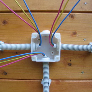 К распределительной коробке снизу подходит питающий кабель, разделяющийся на несколько отходящих проводов.