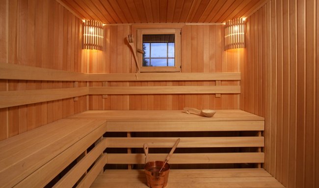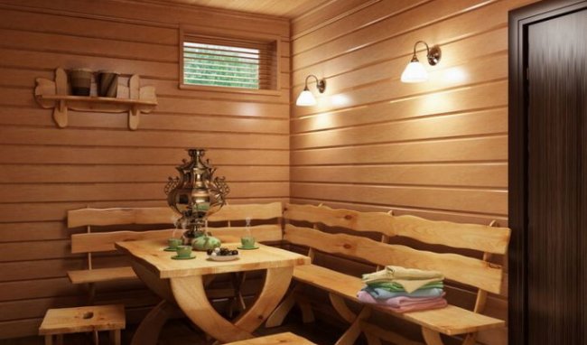 Посмотрите на фото оформления бани: в парилке можно устроить дизайнерский светильник. Для этого просто «загородите» влагостойкий светильник конструкцией из редко расположенных деревянных реек.