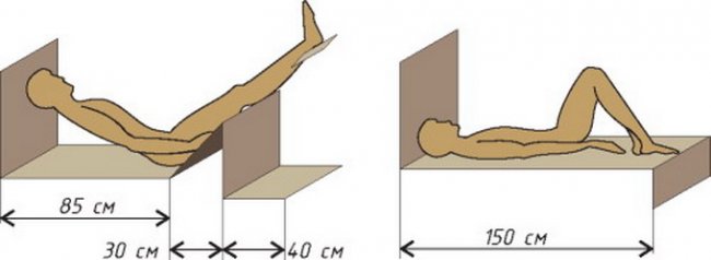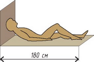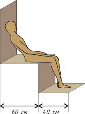 Если полка расположена у стенки, ее ширина должна составлять не менее 40 см для сидения или 60 см для лежания. Длина принимается равной росту человека, а разница высот между ярусами составляет 30-40 см.