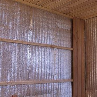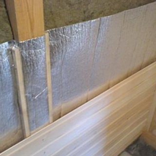 3. Прокладывают между обрешеткой и стеной утеплитель и паробарьер при помощи строительного степлера. В качестве утеплителя применяют базальтовую вату, поскольку она не гниет, не горит и не выделяет в воздух канцерогенные вещества, а также выдерживает температуру до 1500°С.