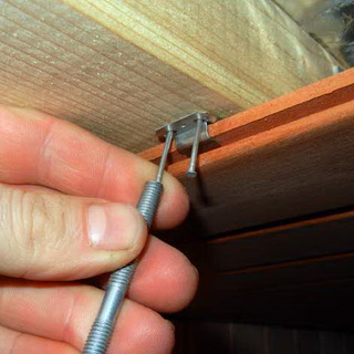 1. Прикреплять материал желательно специальными скобами — кляймерами (скобы изготавливают из пластика и металла). Поскольку обычный металл в бане быстро покроется ржавчиной, кляймеры, саморезы и гвозди должны быть оцинкованными. Их не вколачивают в древесину, а предварительно высверливают для них отверстия.