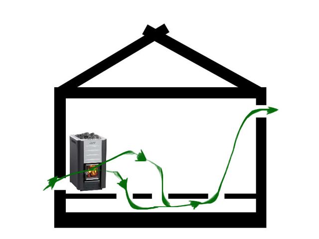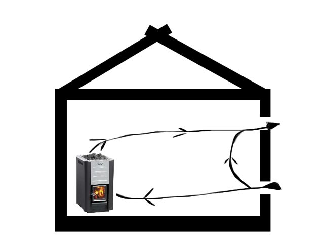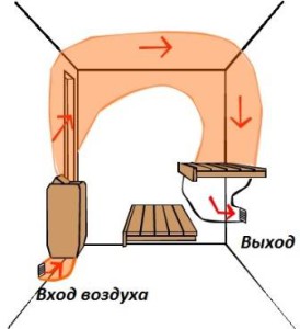Оба отверстия (входное и выходное) располагаются по одной стене, противоположной печи. Воздух поступает из отдушины, находящейся около 0,3 м от пола, а выходит во вторую, расположенную на 0,3 м от потолка. Холодные воздушные массы, попавшие в помещение, нагреваются от печки, поднимаются вверх и, сделав круг, вытягиваются наружу. Такая схема очень удобна, если на улицу выходит только одна стена парилки.