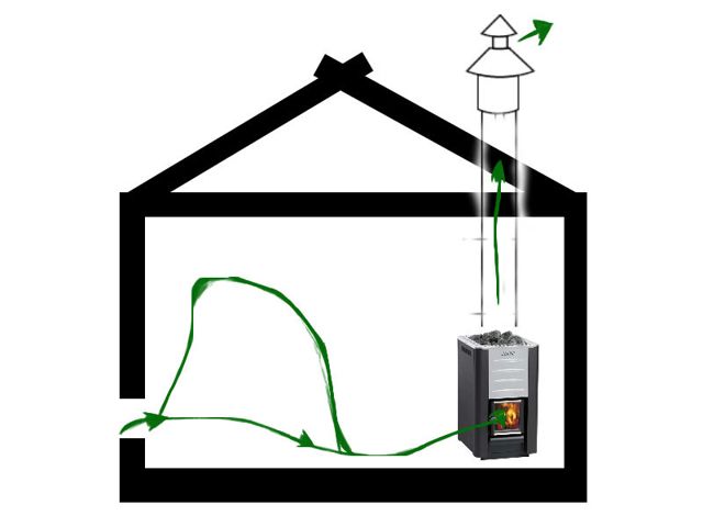 Иногда в качестве вытяжки используют саму печь (каменку). Такой вариант вентиляции работает только при постоянной топящейся печке и функционирует по такому принципу: