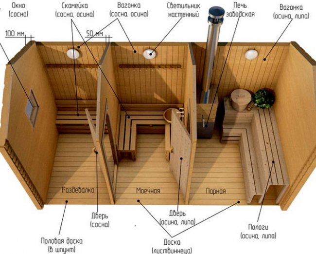 В случае двухкомнатной планировки внутри бани организуют два помещения: