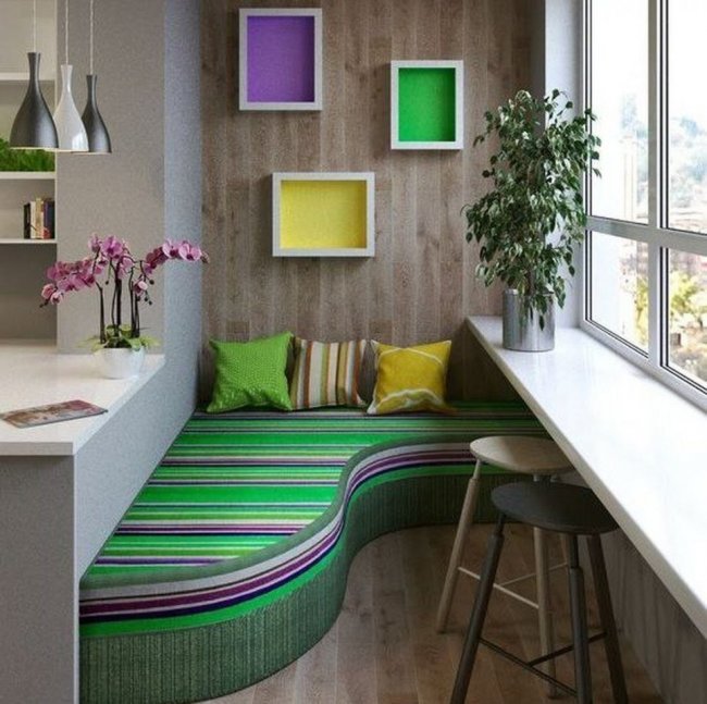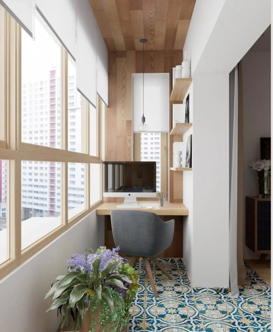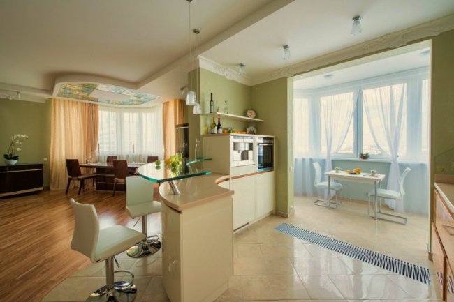 В качестве напольного покрытия используют линолеум, кафель, ламинат. Для зонирования подойдут ковры, ступени. Отделка потолка зависит от типа присоединения балкона. Если это полное совмещение, его делают таким же, как в основной комнате. Потолок в закрытых, отделенных колоннами, подоконником вариантах оформляют пластиковыми панелями, декоративной штукатуркой, краской.