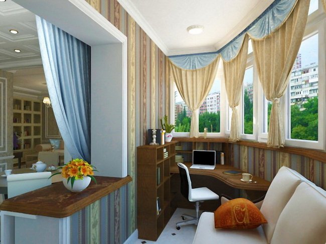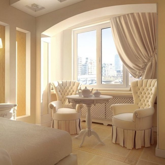 Организация перехода из комнаты на балкон может проводиться несколькими способами. Подходящий вариант выбирают исходя из особенностей помещения и технических возможностей. Если балкон будет продолжением комнаты, проем можно оформить в виде арки. Зонирование можно провести текстилем, раздвижными дверями, складными шторами. Ремонт в панельном доме предполагает наличие подоконника на том же месте. Неудобный элемент максимально заглубляют, придают ему вид столика, барной стойки. Для каждой комнаты, которую решено совмещать с балконом, есть множество идей оформления и зонирования.