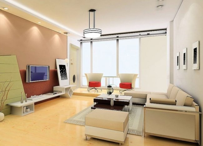 Цвета отделочных материалов пола, потолка, стен должны гармонировать между собой и с основным тоном в жилой комнате. Акцентными могут быть каменные вставки, картины, горшки с живыми цветами. Сочетание красок выбирают сами владельцы квартиры на свое усмотрение.