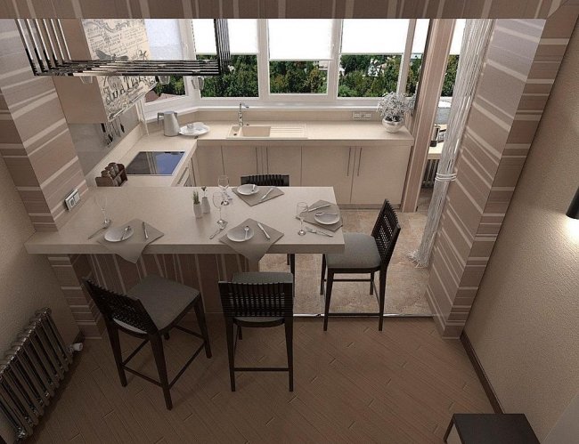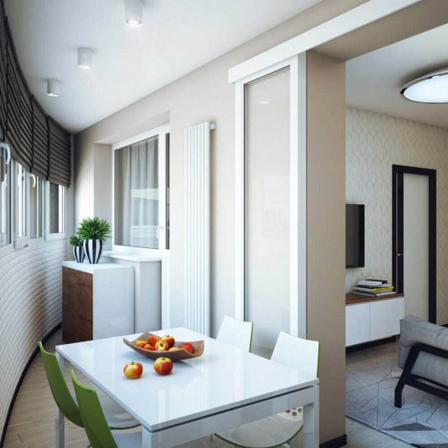 Без совмещения. Бюджетный вариант присоединения позволяет сделать уютную обеденную зону на свежем воздухе без дорогостоящей перепланировки. Иллюзию общего пространства создаст раздвижная дверь вместо привычной балконной конструкции, панорамные окна.