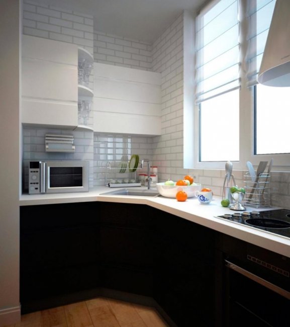 Полностью. Такой способ позволяет максимально использовать добавленное пространство. Между кухней и балконом стена сносится полностью, перепад уровня пола корректируется выравниванием или установкой ступеньки. Проем можно сделать в виде арки, боковых колонн. Полностью совмещенная кухня имеет необычную планировку, становится светлее.
