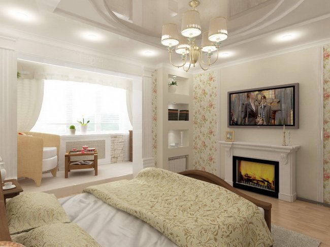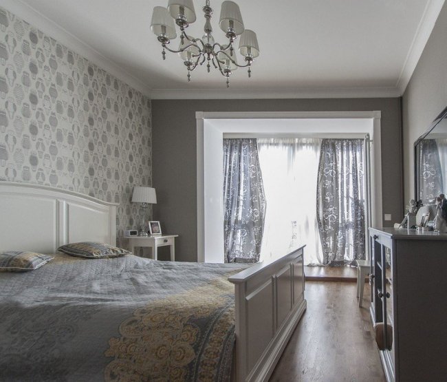 Если слияние спальни с балконом происходит для увеличения пространства, оформлять такую комнату надо в одном стиле. Подоконник убирают полностью, делают единое напольное покрытие.