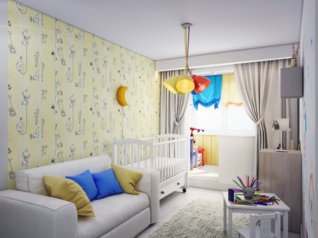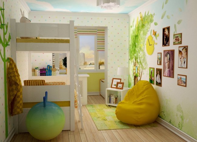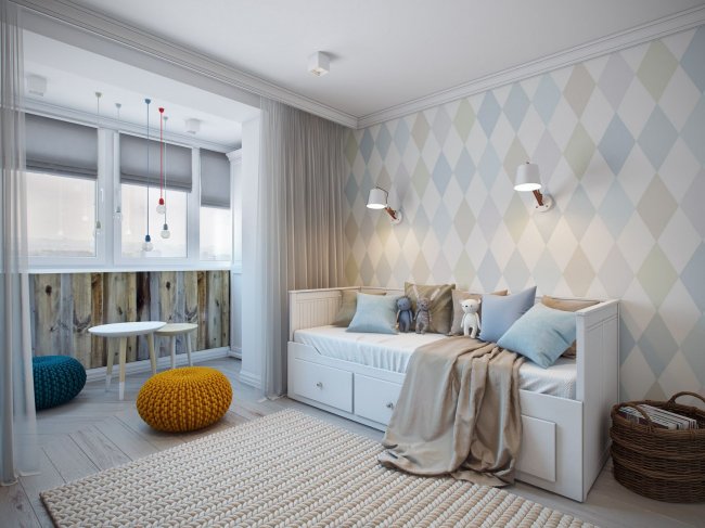 Объединение двух пространств позволит увеличить в детской комнате площадь для игр, хранения игрушек, личных вещей. В появившейся зоне можно поместить письменный стол, стеллаж с книгами, сделать спортивный уголок, обустроить место отдыха или пункт наблюдения за звездами.