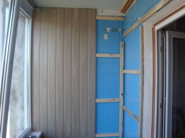 Слой утеплителя нужно аккуратно проложить между рейками. Хотя ассортимент материалов обширен, большинство выбирают дешевый, но от этого не менее эффективный, пенопласт. Он идеально подходит для «сырых» балконов, так как не боится влаги, как минеральная вата, к примеру. Для нее пришлось бы дополнительно устанавливать слои гидро- и пароизоляции. Стыки между кусками пенопласта заполняются монтажной пеной, после чего можно приступать к монтажу пластиковых панелей.
