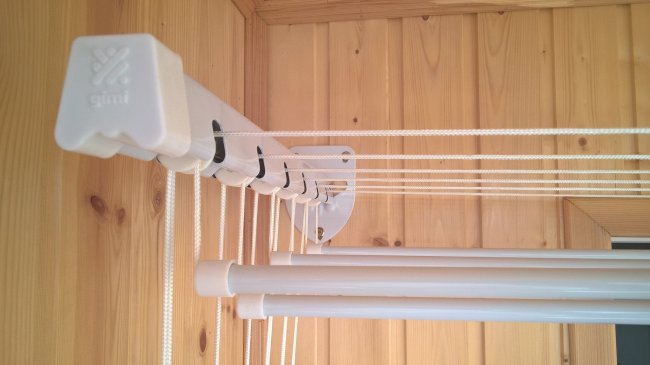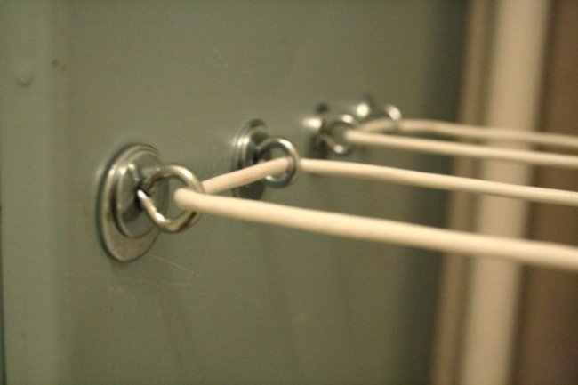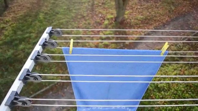 Конструкция. Современные модели оснащаются передвижными блоками с бельевыми веревками. Таким образом, чтобы повесить вещи для сушки, нужно лишь переместить не занятую вещами веревку, провернув ее на блоке. Развешивать белье на моделях без движимых элементов не очень удобно.