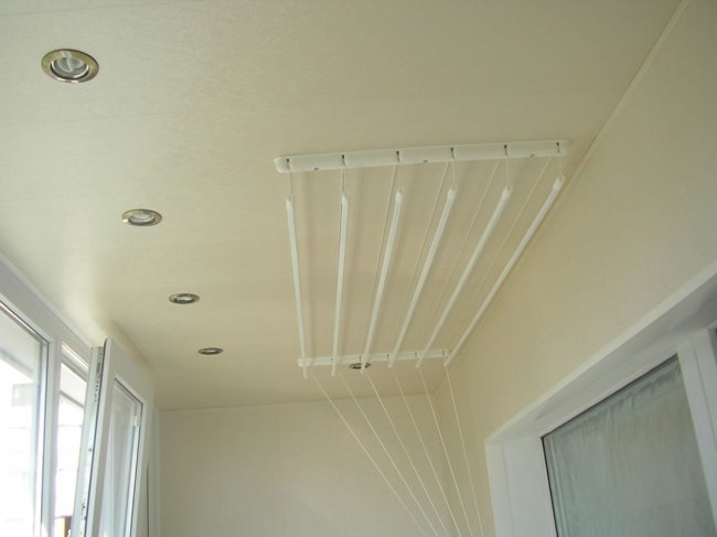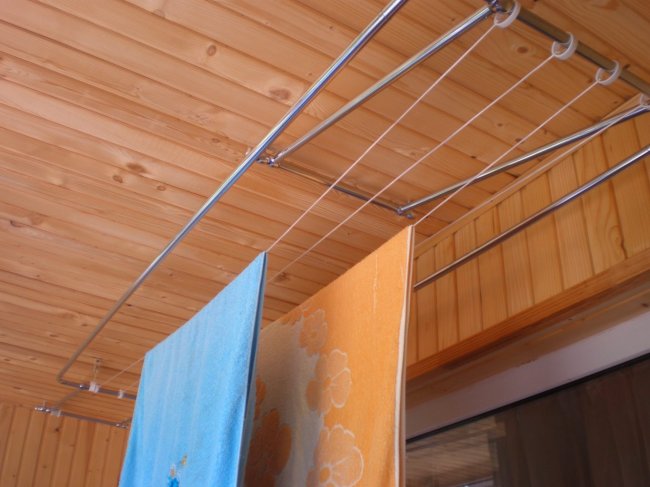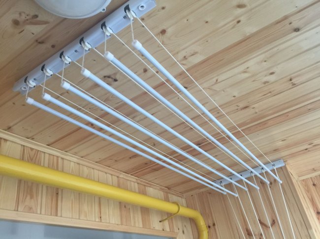 Крепление балконной сушилки на потолке позволяет значительно сэкономить свободное пространство помещения, исключить его нагромождение. Различают два основных вида таких моделей: