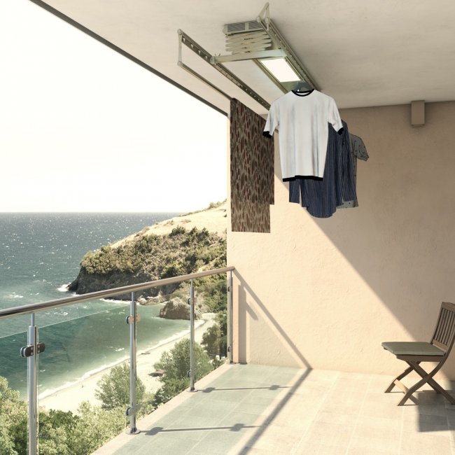 Наличие сушилки для белья на балконе позволяет в любое время года удобно просушивать вещи. Выгодное отличие такого размещения сушилок в отличие от ванной является минимальная влажность во вспомогательном помещении, а также экономия свободного места ванной комнаты. Найти подходящую сушилку даже для небольшого балкона не составляет особого труда. Многообразие моделей позволяет найти оптимальный вариант с практичной и компактной конструкцией. К минусам установки сушилки на балконе относится необходимость дополнительной подготовки места для раскладных моделей или же креплений для стационарных подвесных моделей. Кроме того, на неотапливаемом балконе обычная сушилка в зимний период будет малополезной: на ней одежда будет сохнуть очень долго и возможно, ее придется все равно досушивать в комнате или ванной.
