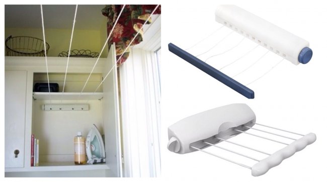 подвесные: стационарные модели, между металлическими боковинами которых натягивается бельевая веревка, занимают свободное место под потолком.