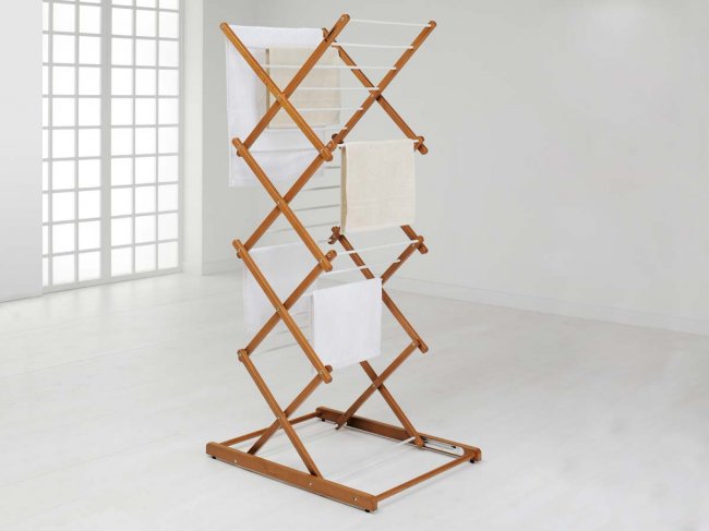 Как понятно по названию, деревянные сушилки изготавливаются из дерева. Для производства дорогих моделей используется древесина таких пород, которые отличаются высокой устойчивостью к воздействию влаги (лиственница, кедр, дуб). К бюджетным деревянным сушилкам относятся модели, изготовленные из сосны, ели. Изделия дополнительно покрываются лаком с защитными свойствами, что обеспечивает их долгий срок службы. Но, несмотря на качество обработки, недорогие изделия спустя 1-3 года эксплуатации (в зависимости от частоты и условий использования) могут прийти в негодность. В лучшем случае для них потребуется лишь повторная обработка лаком. В худшем варианте (такое часто происходит при размещении деревянной сушилки на неотапливаемом балконе) на некоторых участках могут появиться темные пятна (гниль, плесень). Сама древесина может стать крохкой.