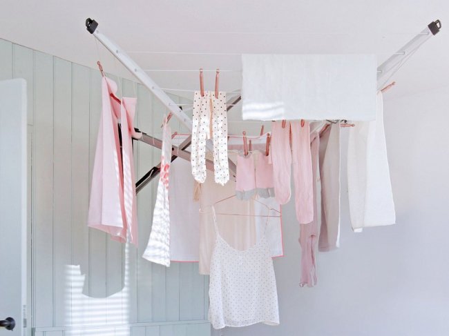 Таким образом, чтобы повесить вещи, хозяйке придется подтянуть (опустить) сушилки. После развешивания вещей она может легко поднять сушилку под потолок, чтобы одежда не мешала проходу.