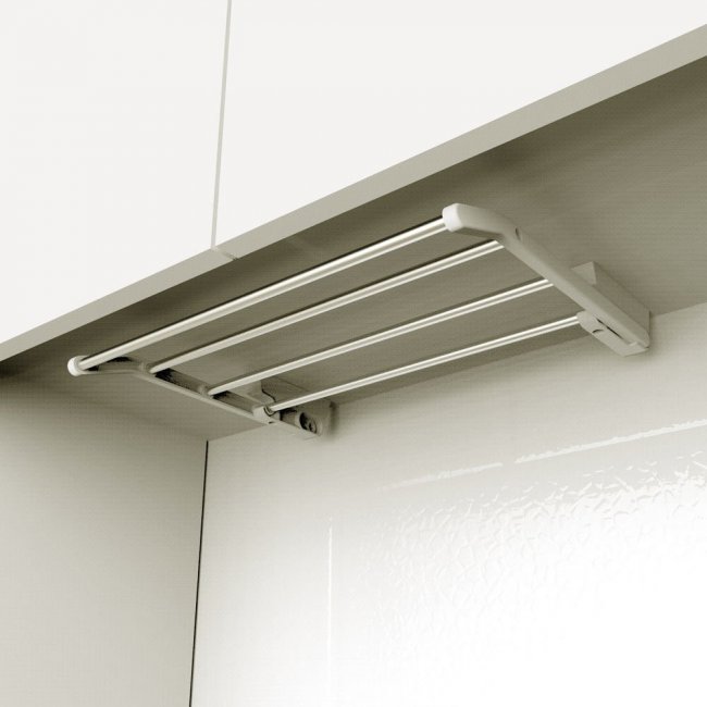 выдвижные: представляют собой конструкцию, выдвигаемую (в сторону или вниз) для доступа к планкам и стержням для сушки вещей. Относятся к компактным моделям;