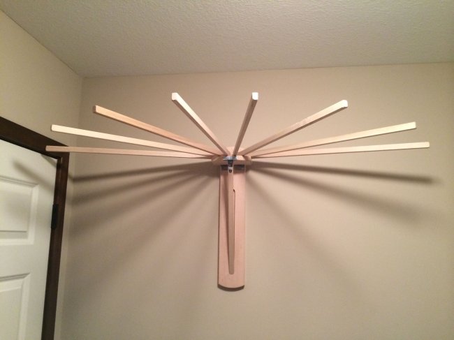 С отдельно регулируемыми стержнями. Высота расположения отдельных стержней регулируется отдельной веревкой (закрепляется на стене), что позволяет удобно вешать вещи и в то же время правильно их сушить.