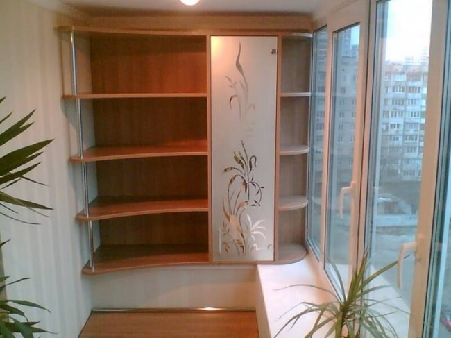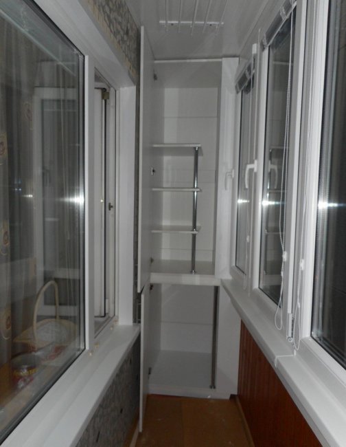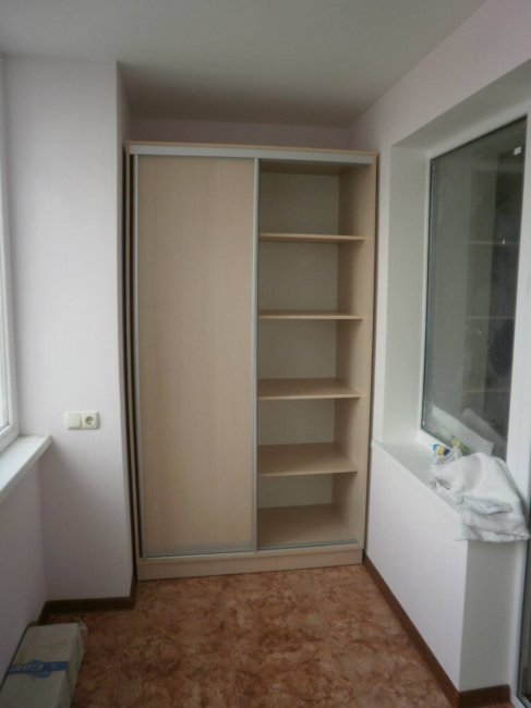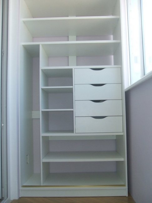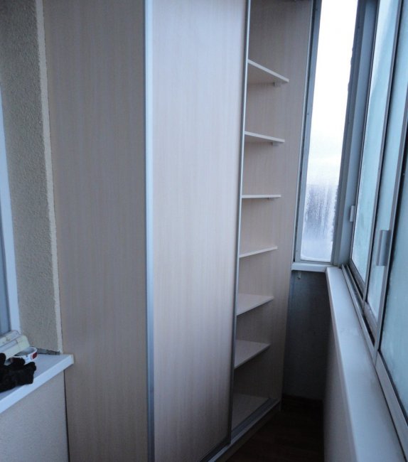встроенный – такой шкаф делается точно по размерам ниши, отведенной для него. Заказать нужно только дверцы, так как стенками, полом и потолком для него будет служить сам балкон. За счет этого существенно уменьшается вес готовой конструкции. Наполнение встроенного шкафа может быть самым разным – разнообразные полочки, корзины, выдвижные ящики.