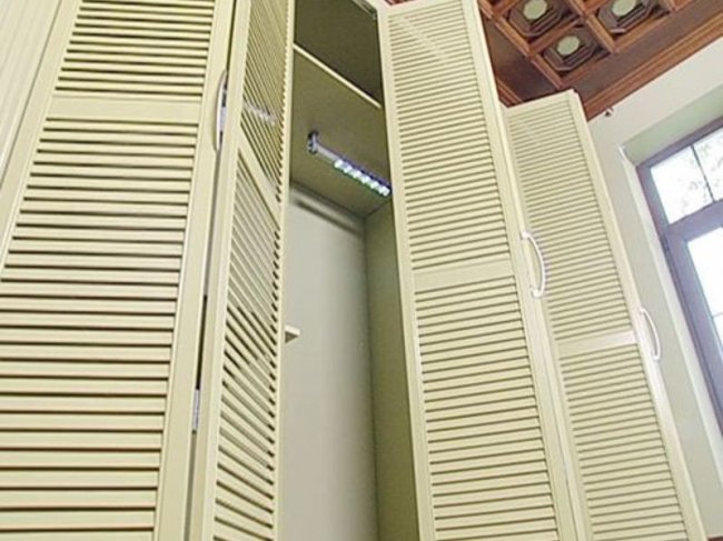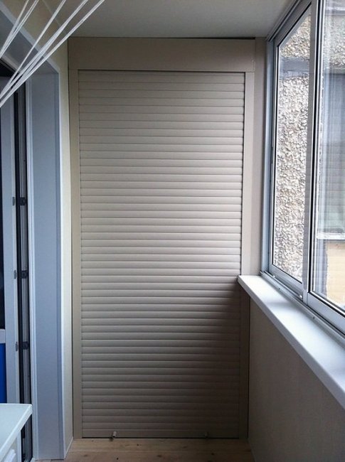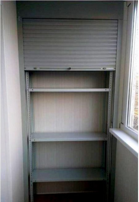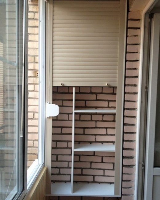 Ниша с опускающейся железной шторой – отличный вариант для балконной кладовки. Жалюзи в качестве дверей будут уместны как в обычной системе хранения, так и в угловой. Места для открывания дверей не требуется, тем не менее есть доступ сразу ко всему содержимому шкафа. Установка не занимает много времени. Рольставни экономят пространство, легко отмываются и не выгорают. Алюминиевая занавеска преградит дорогу ярким солнечным лучам, влаге и пыли. Однотонная светлая штора визуально расширит пространство, а если покажется слишком скучной – можно нанести на нее рисунок – аэрографию. Недостаток таких дверей в том, что для того, чтобы открыть или закрыть шкаф, необходимо наклоняться. Еще один минус жалюзи в их низкой функциональности. На их поверхности ни внутри шкафа, ни снаружи невозможно разместить крючки, подвесы, полочки, зеркала. Но на балконе можно обойтись и без зеркал, а дополнительные органайзеры вмонтировать в боковые и заднюю стенки.